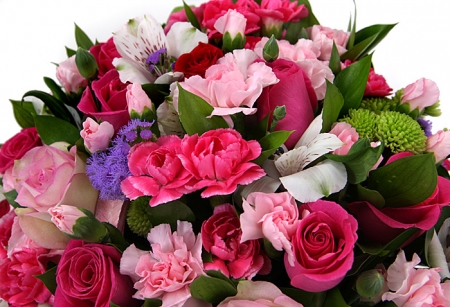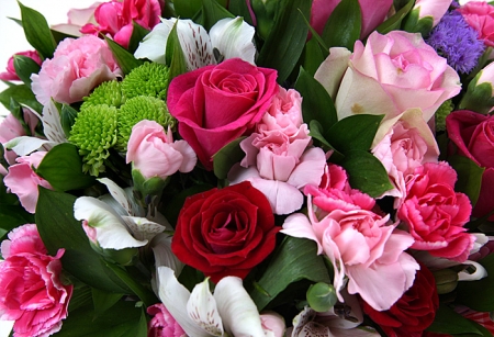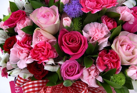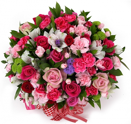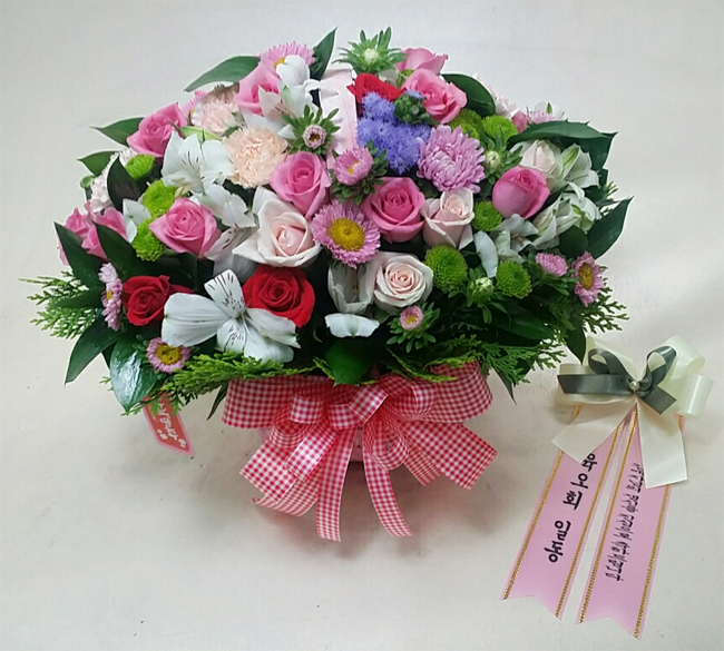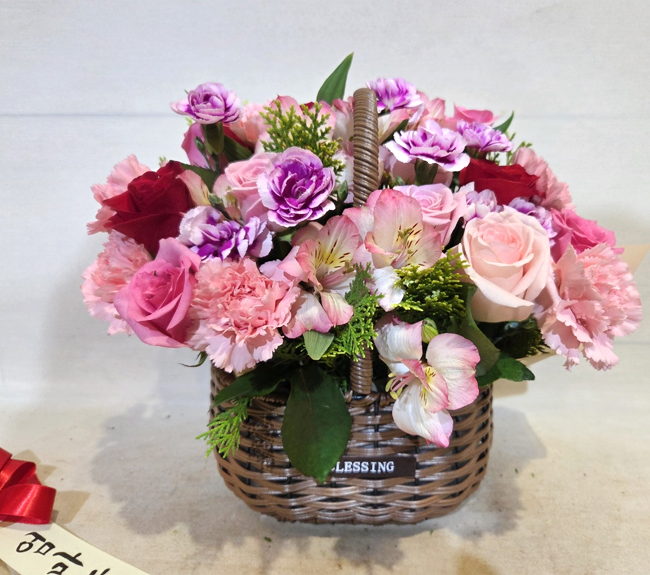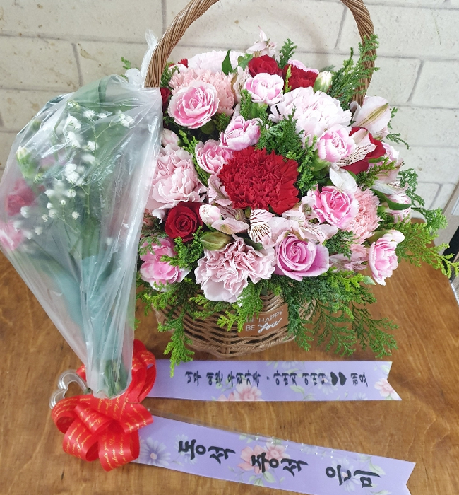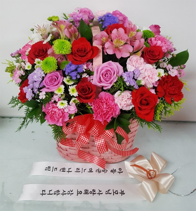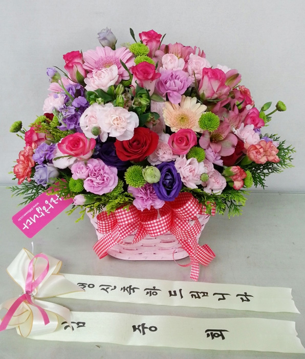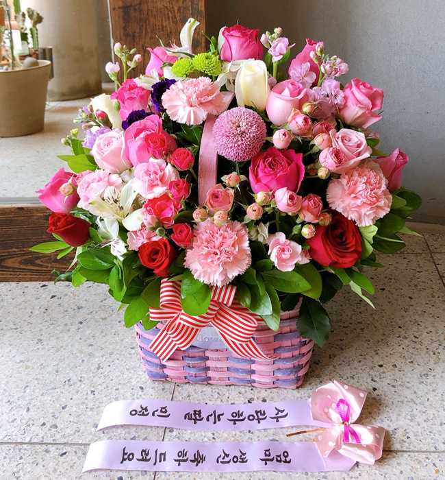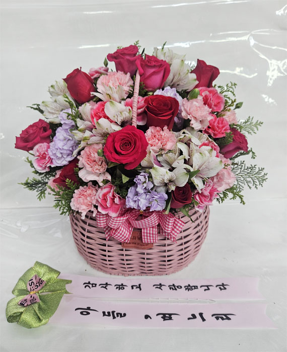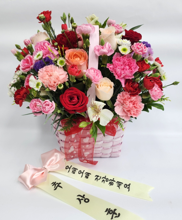 핑크, 붉은 장미, 핑크 스프레이 카네이션, 각종 계절 꽃 및 계절 그린소재, 수제 꽃바구니(바구니 모양 및 색상은 지역에 따라 변경될 수 있음), 축하메세지 리본 또는 카드.