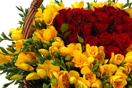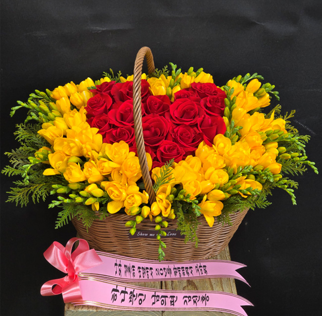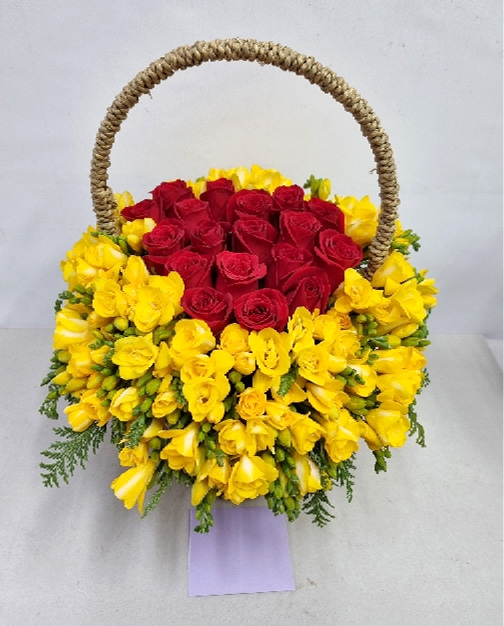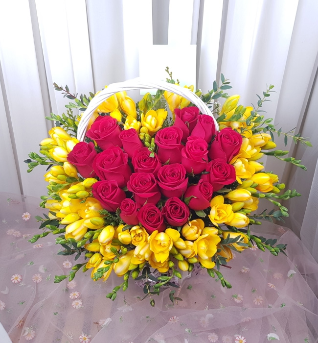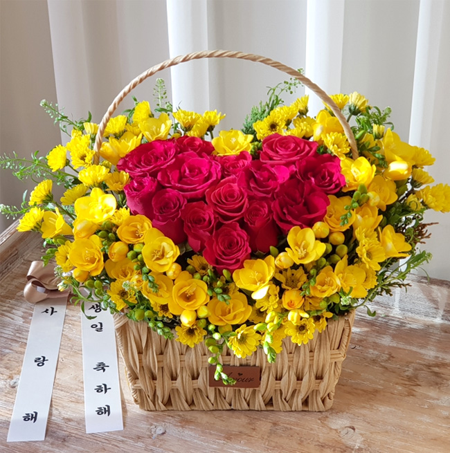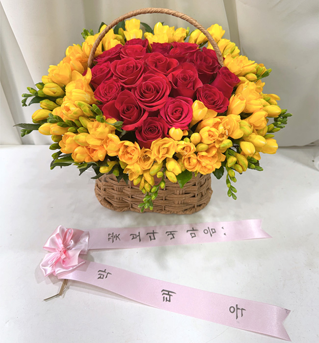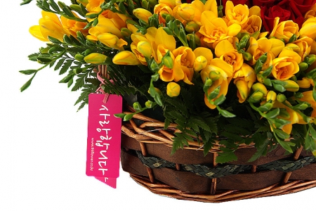 후리지아, 레드장미, 그린계절소재, 수제바구니, 리본 또는 카드.