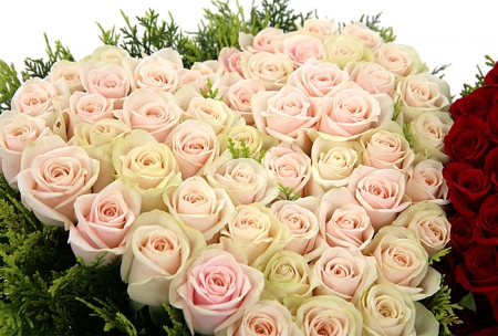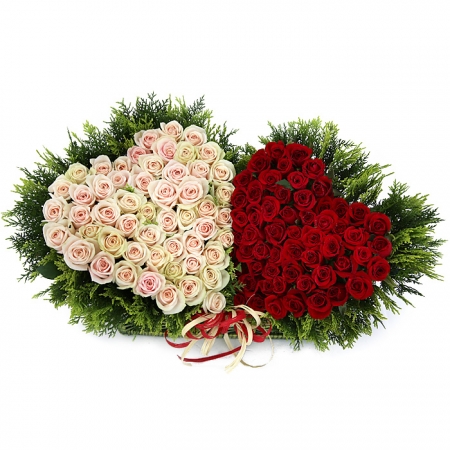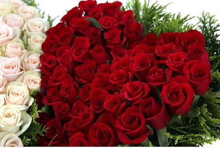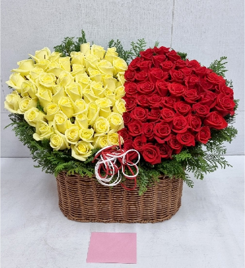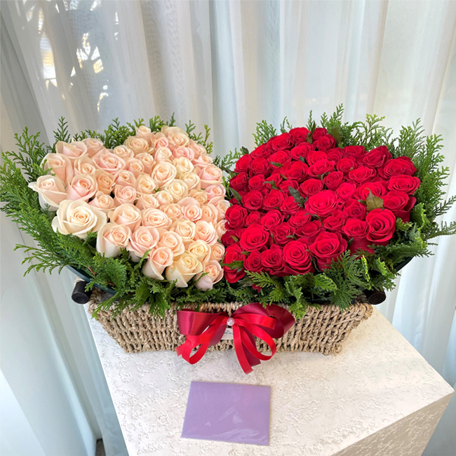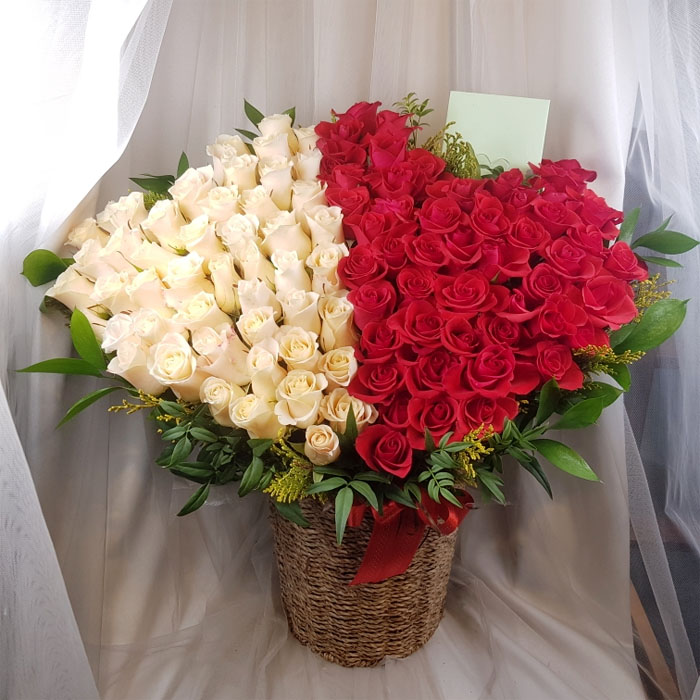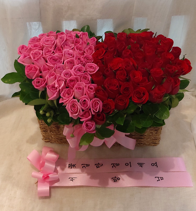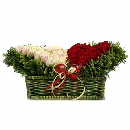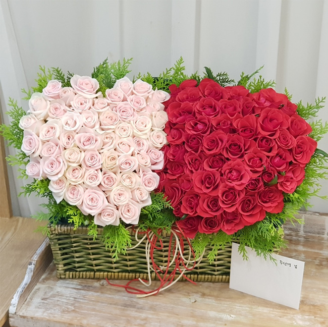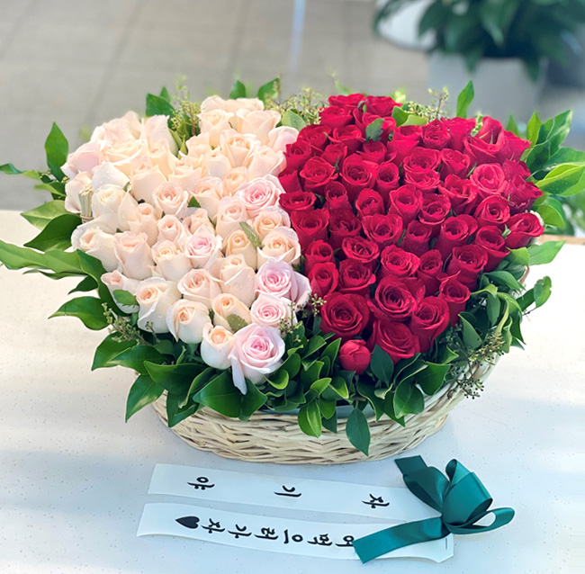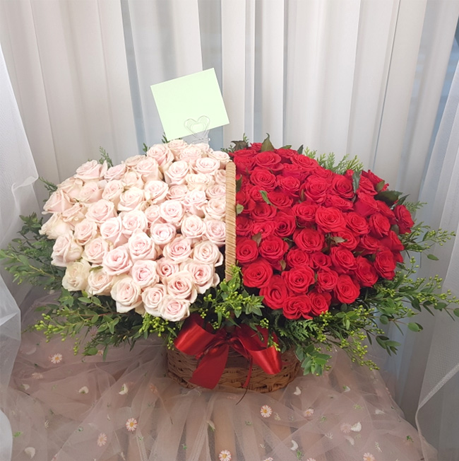 백장미, 레드장미, 그린소재, 수제바구니, 리본 또는 카드.