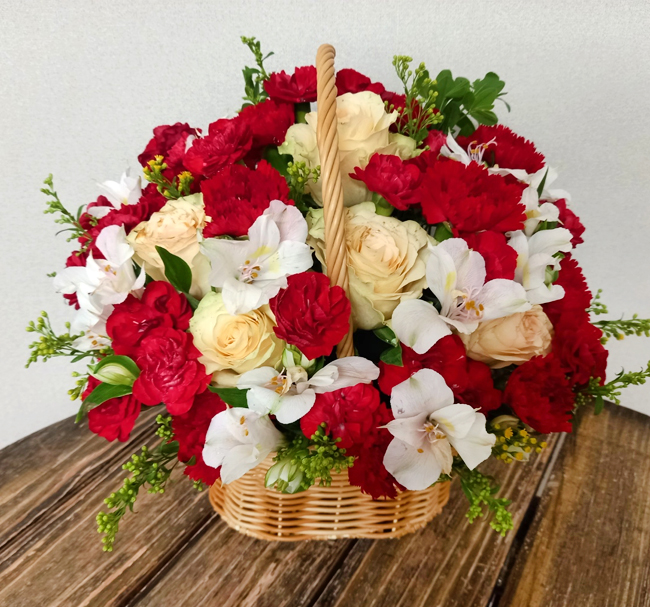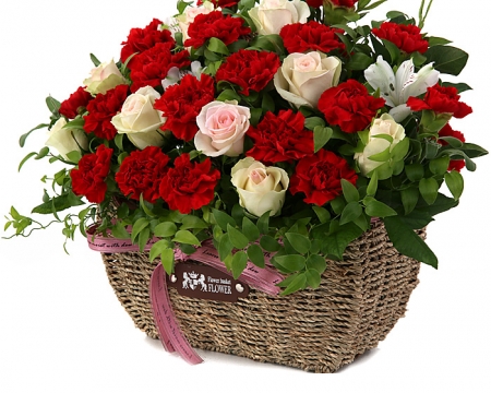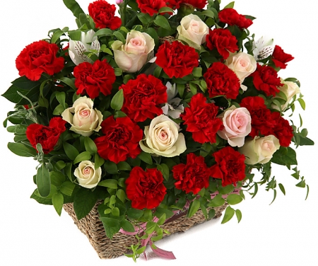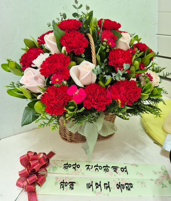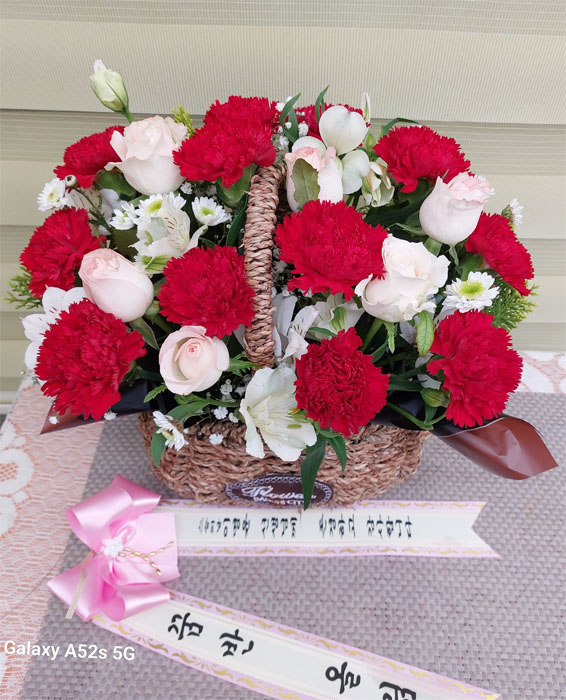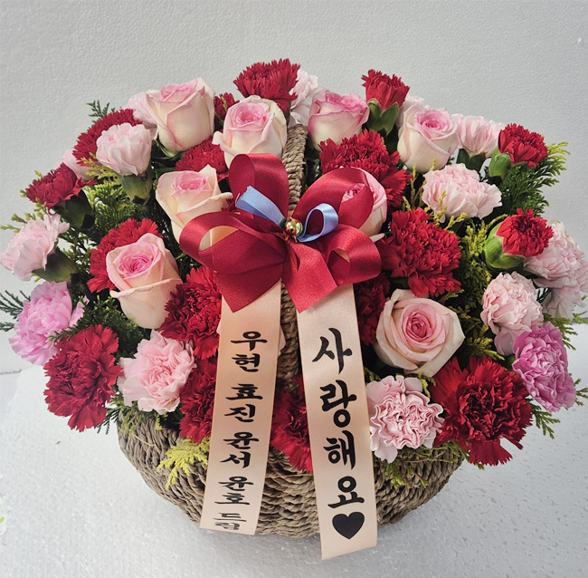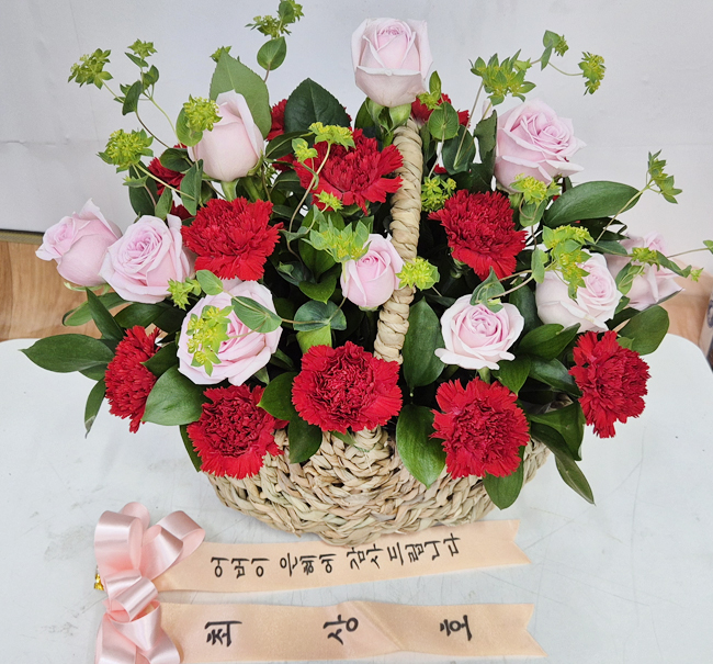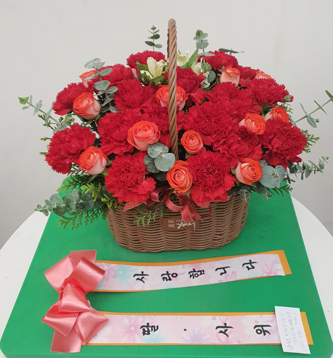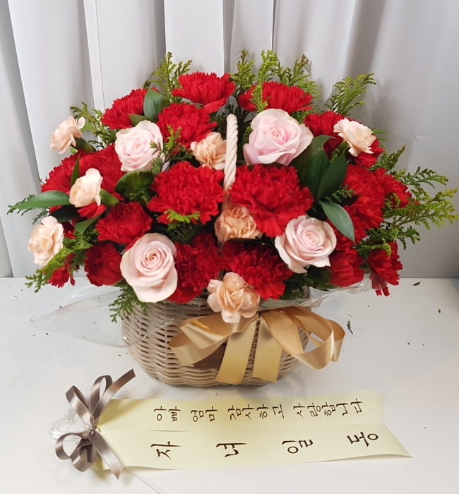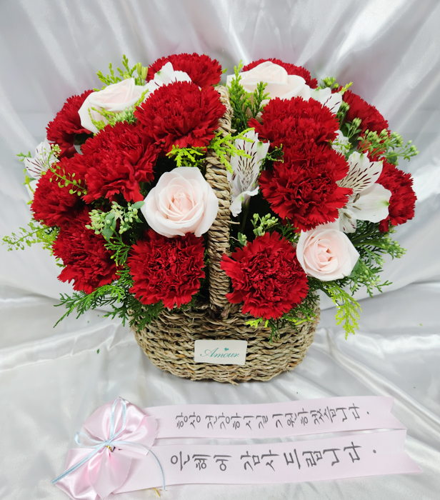 카네이션, 계절꽃, 계절 그린소재, 수제바구니, 리본 또는 카드.