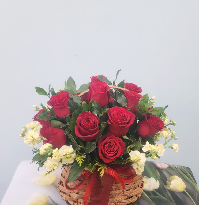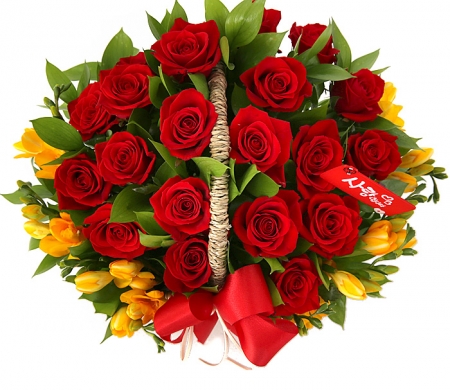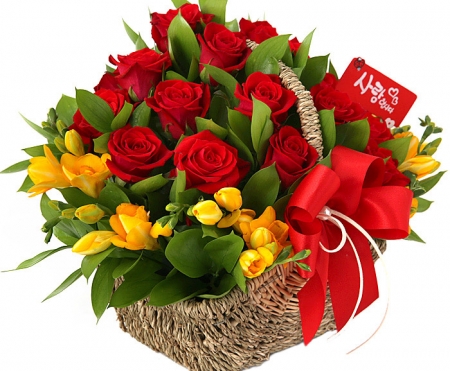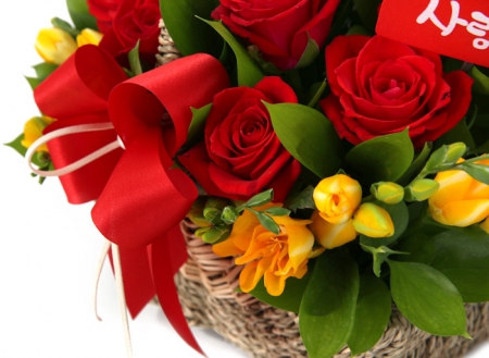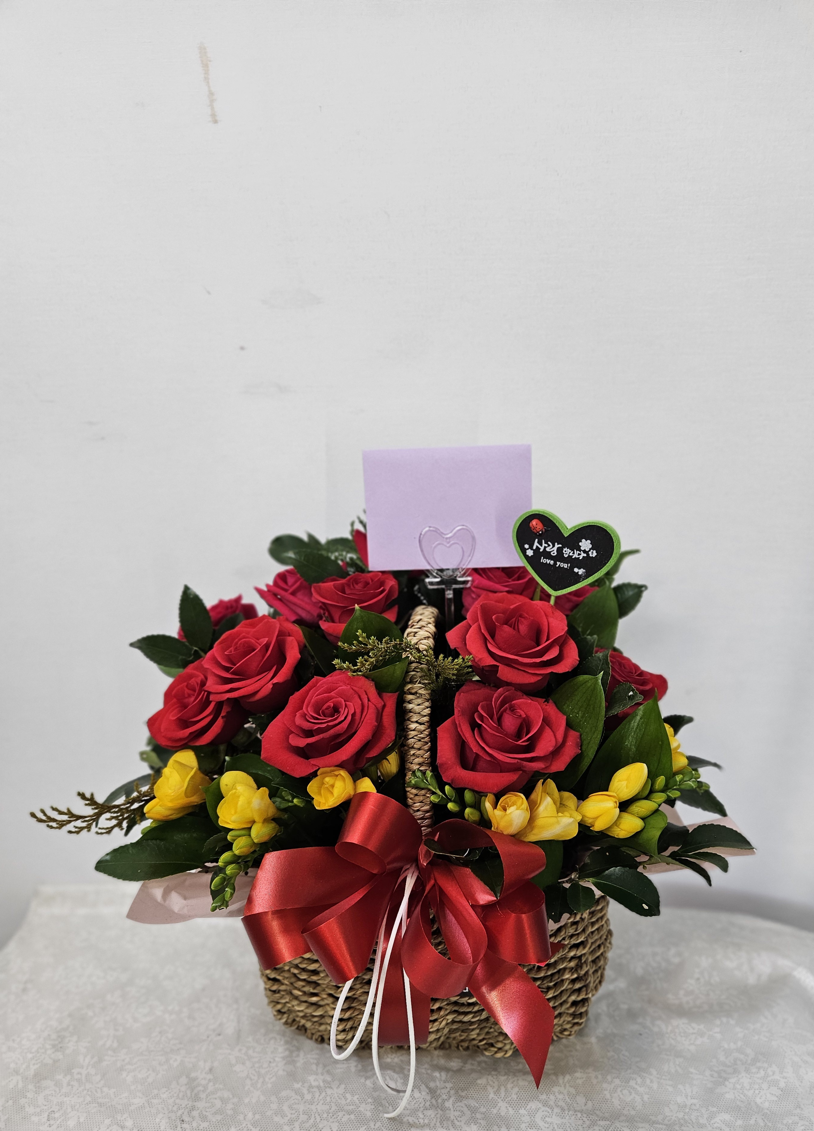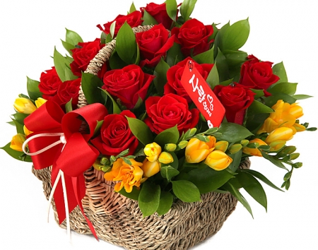 붉은장미, 후리지아, 계절 그린소재, 수제바구니, 리본 또는 카드.