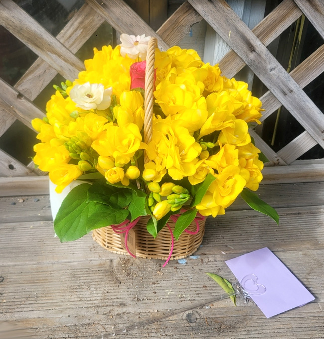 프리지아, 각종 계절 꽃 및 계절 그린소재, 리본 또는 카드.
