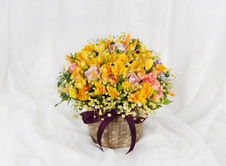 프리지아, 안개, 장미, 각종 계절 꽃 및 계절 그린소재,리본 또는 카드.