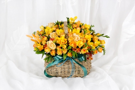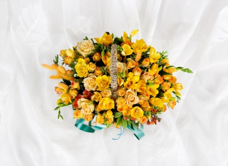 프리지아, 장미, 각종 계절 꽃 및 계절 그린소재,리본 또는 카드.