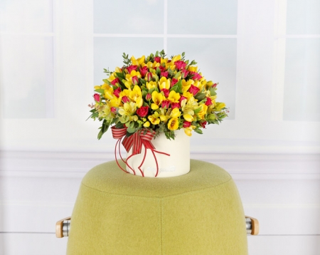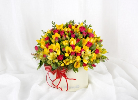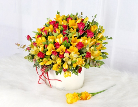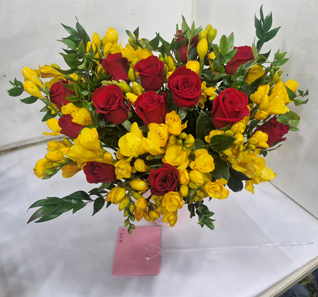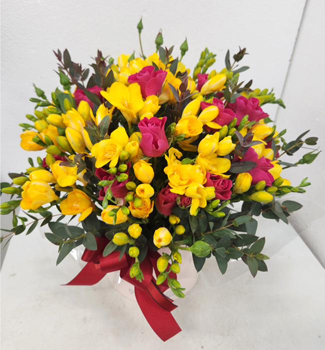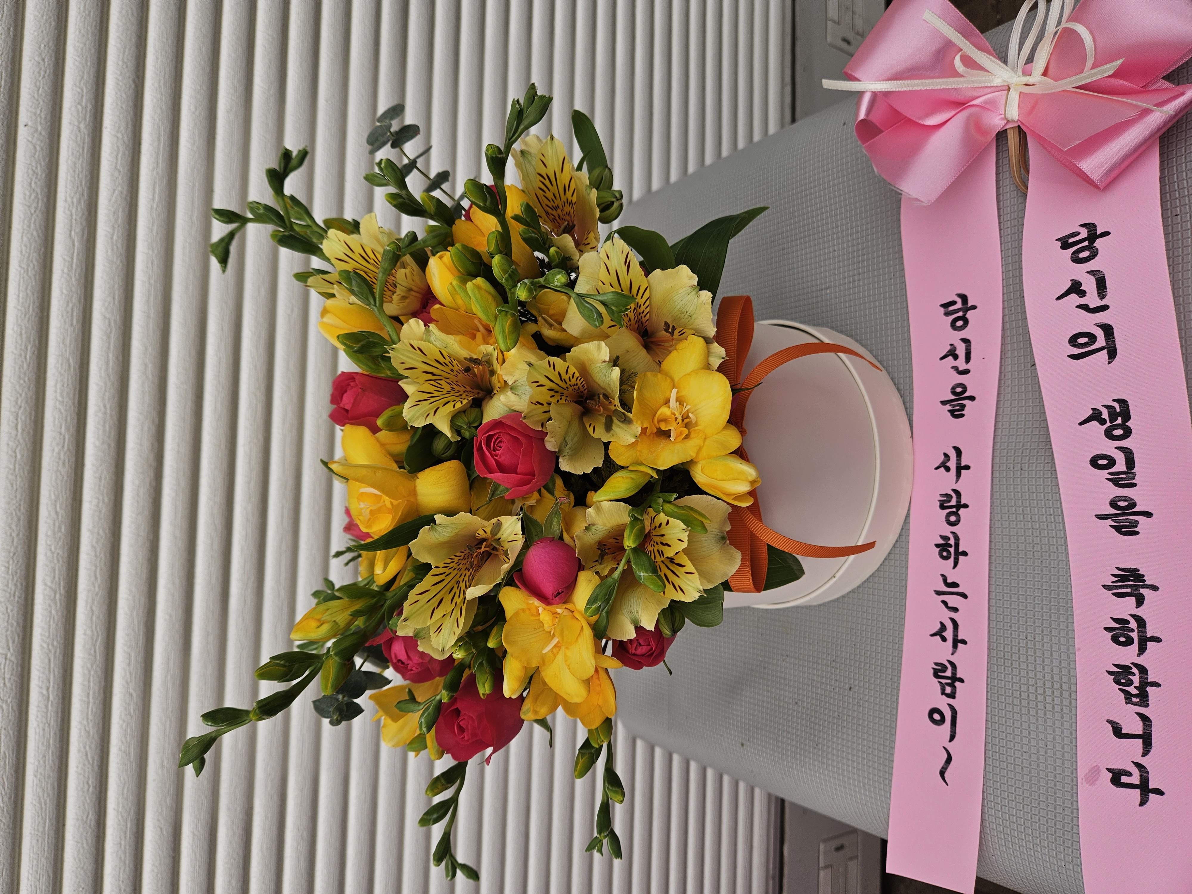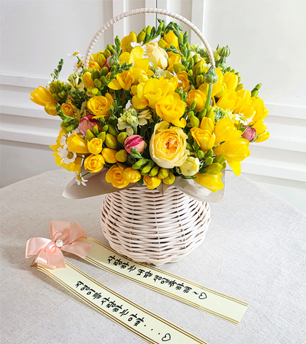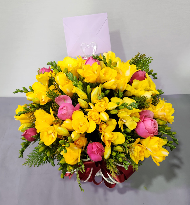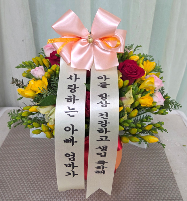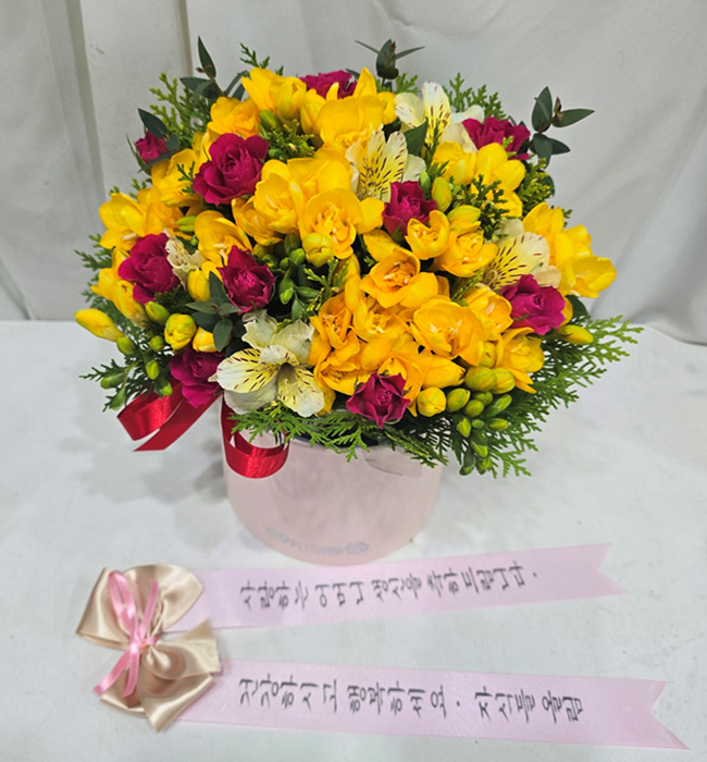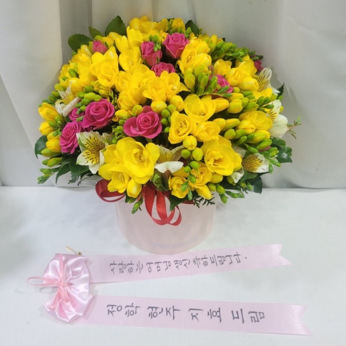 프리지아, 각종 계절 꽃 및 계절 그린소재, 리본 또는 카드.