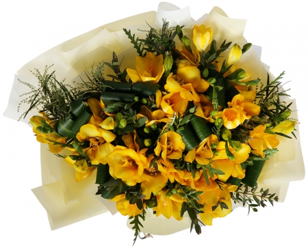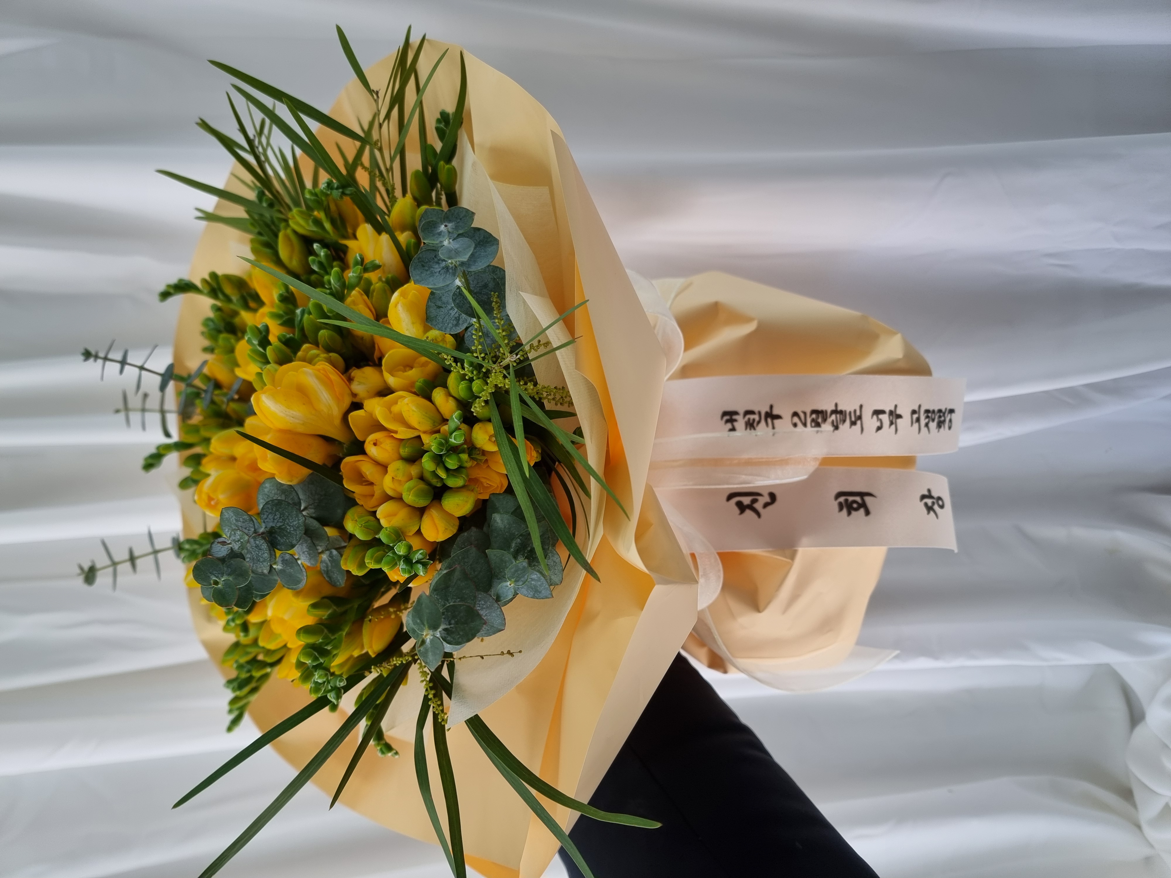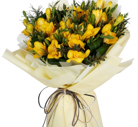 프리지아, 계절 초화, 축하 메세지 리본 또는 카드.