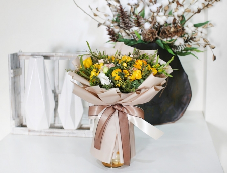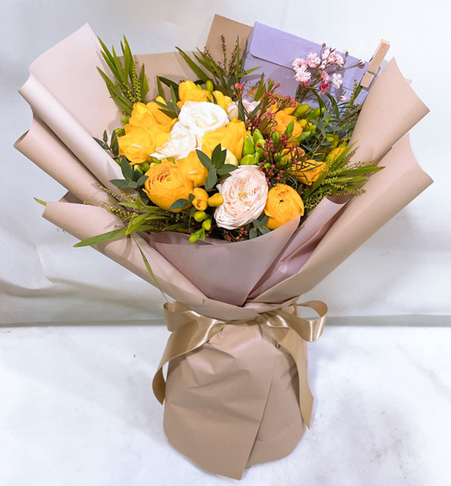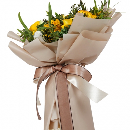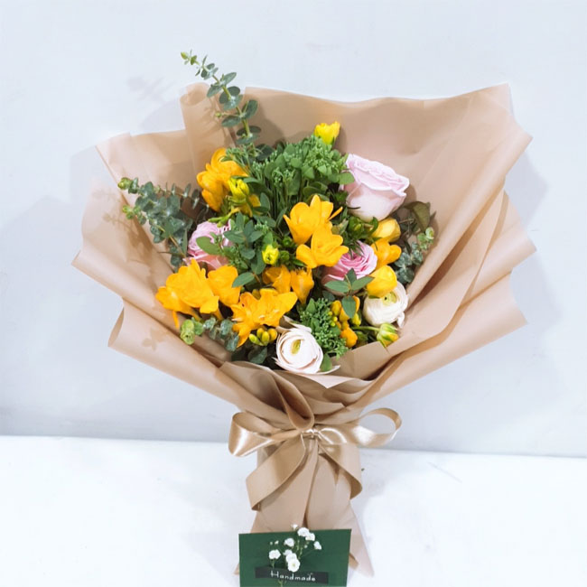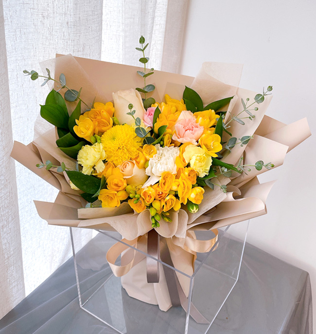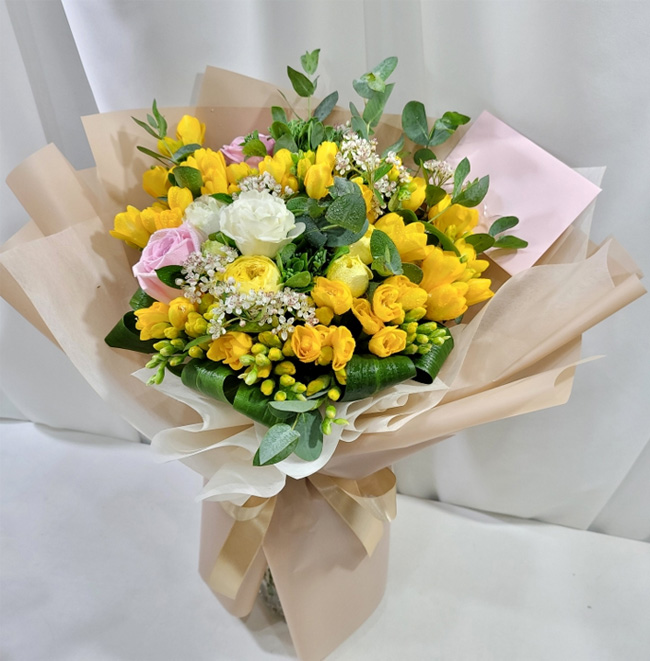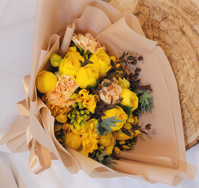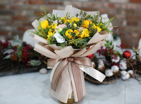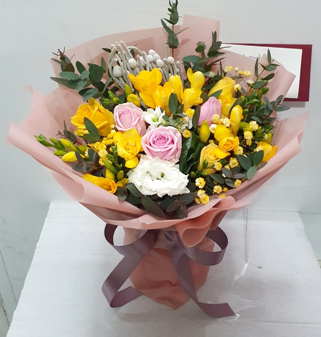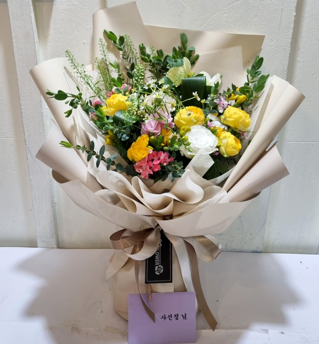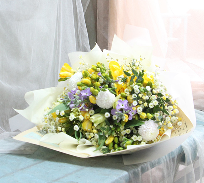 | 졸업식에 가져갔어요. 새로운 시작이라는 다발의 의미도 한 몫 했습니다. 봉오리 진 노란 장미와 향기가 짙은 후리지아가 너무 좋았습니다. 꽃병 둘로 나누어 꽂아 거실에 두니 매우 만족스러웠어요. 싱싱했어요. |