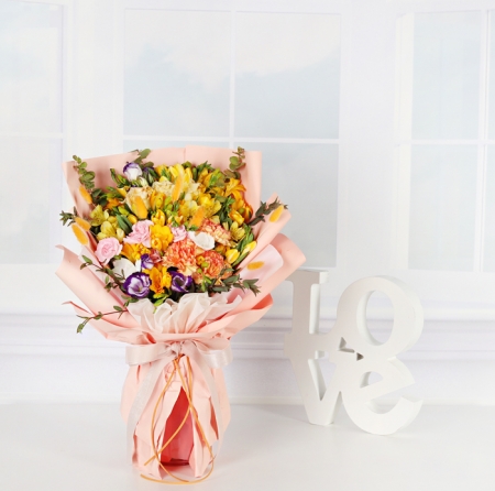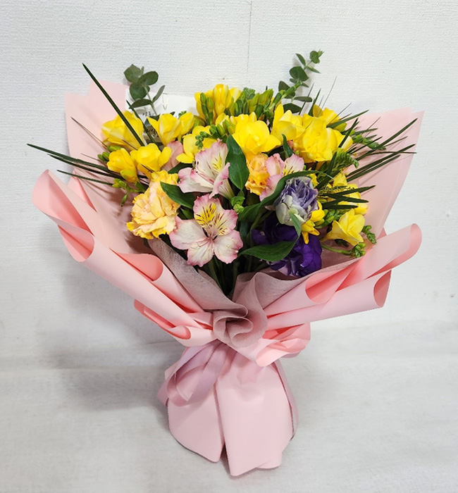 프리지아, 각종 계절 혼합꽃 및 계절 그린소재, 리본 또는 카드.
