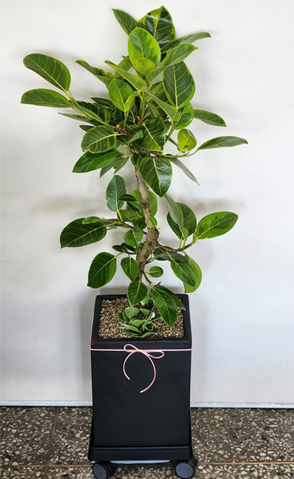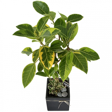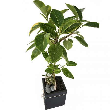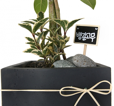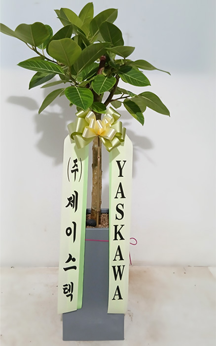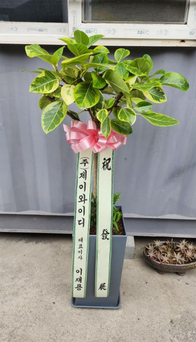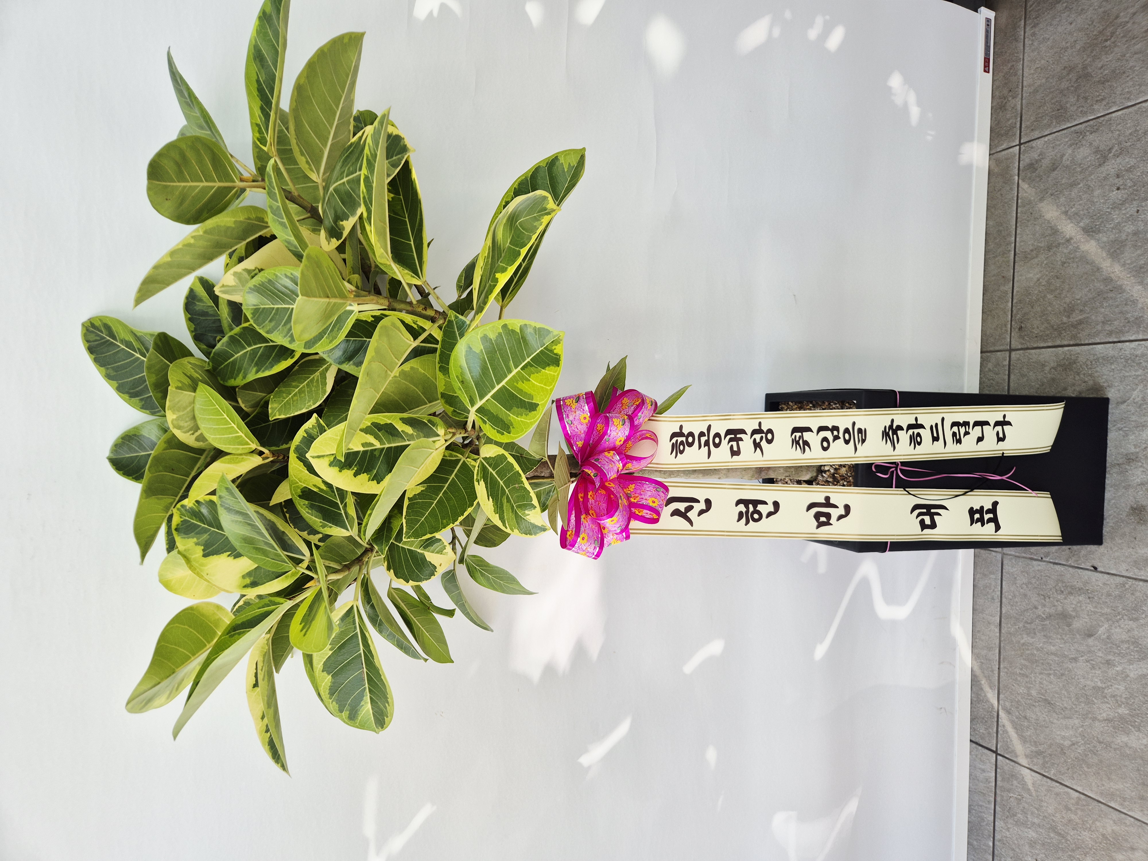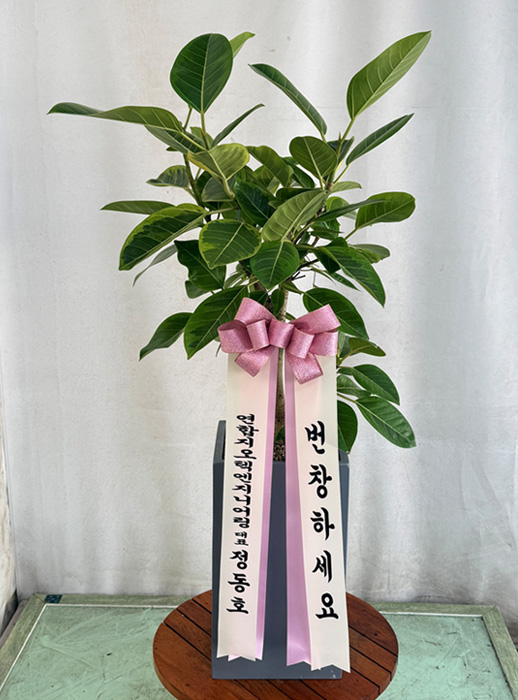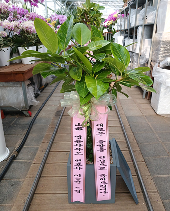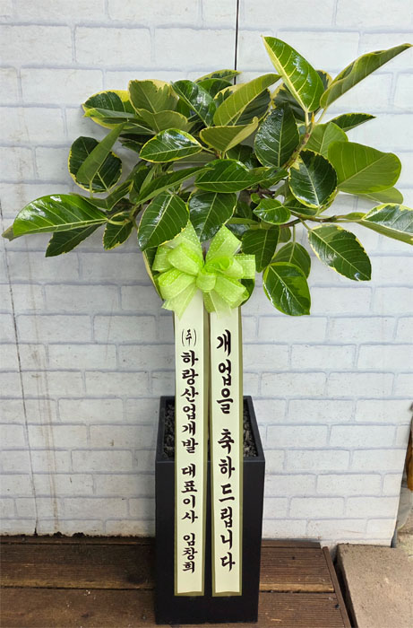 뱅갈 고무나무, 계절 초화, 축하 메세지 리본 또는 카드.