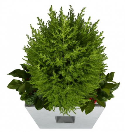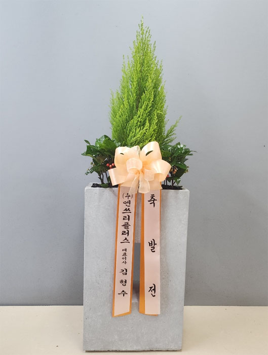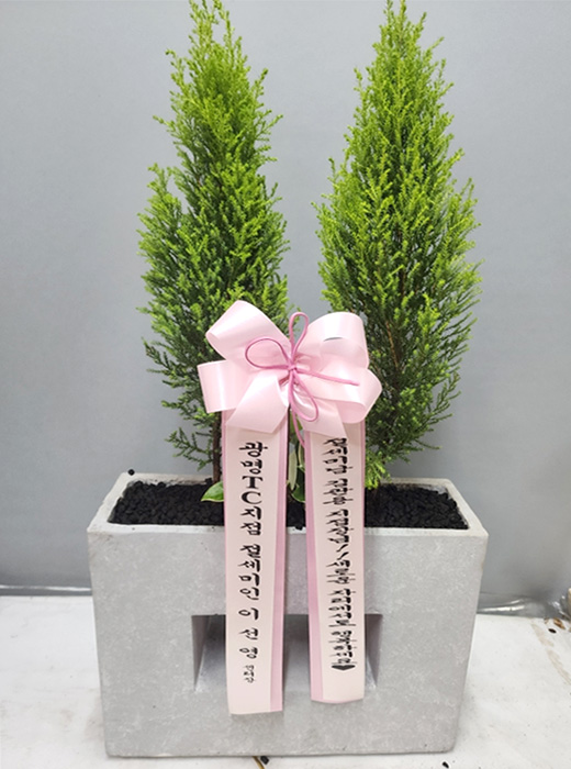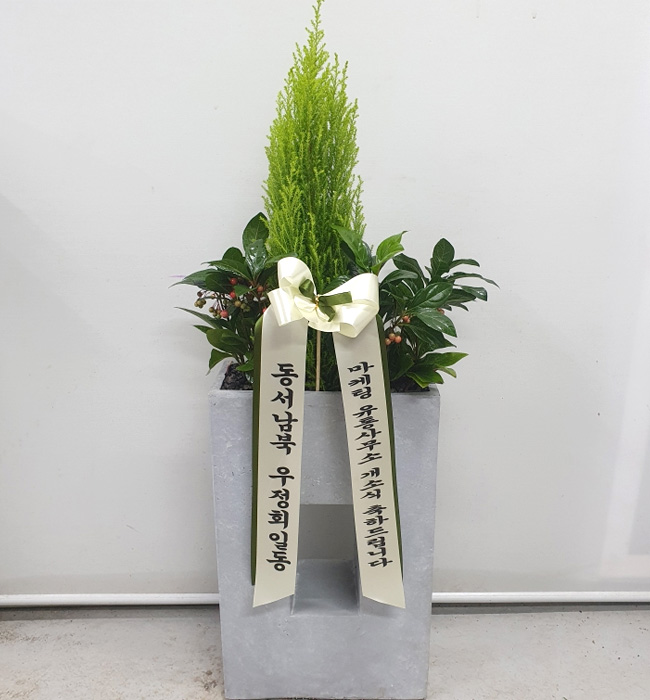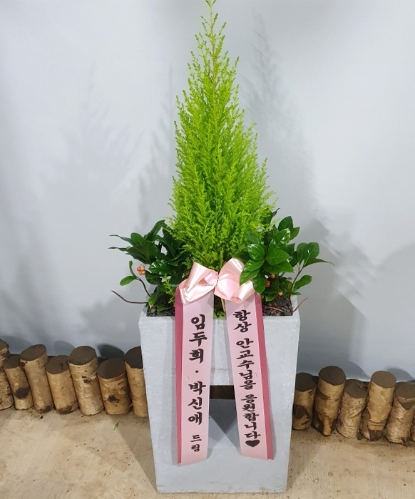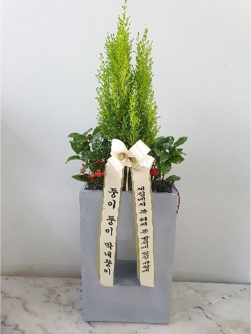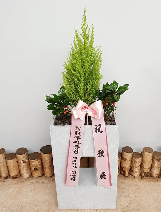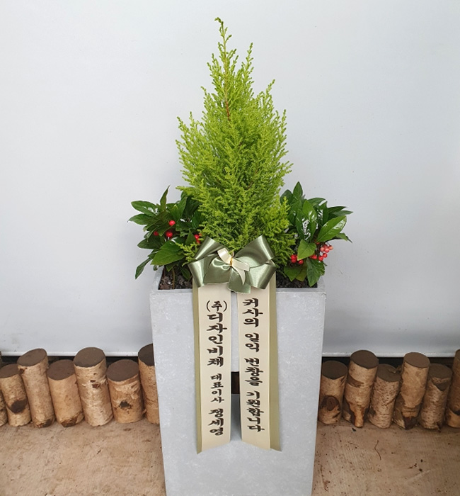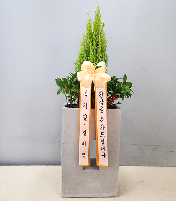 율마, 계절 초화, 축하 메세지 리본 또는 카드.