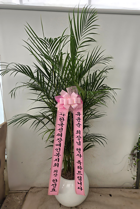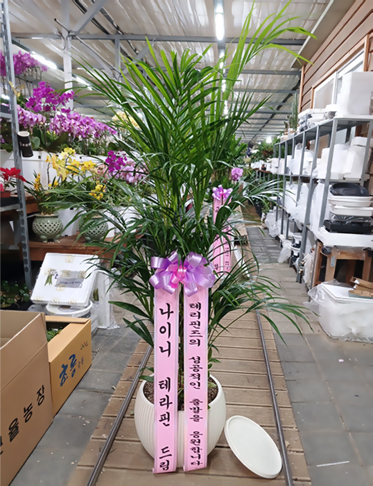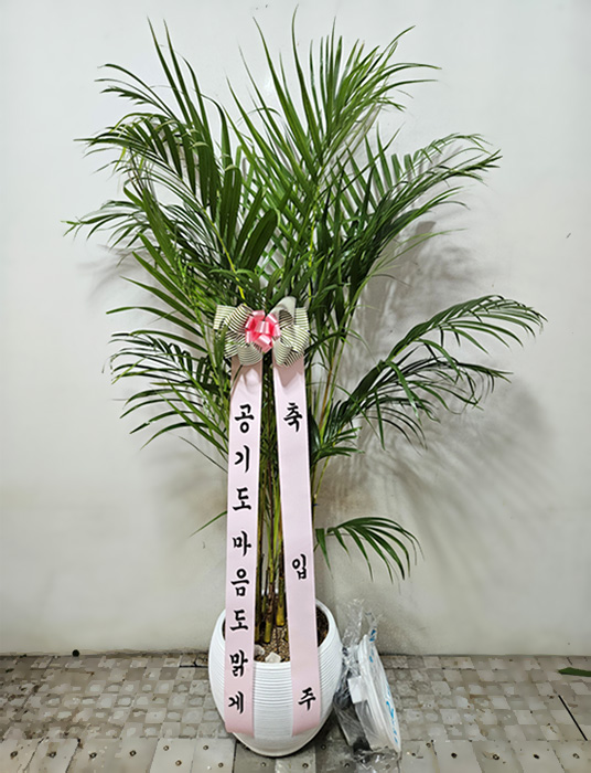아레카야자, 계절초화, 축하 메세지 리본 또는 카드.