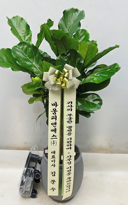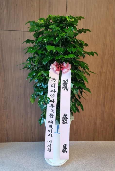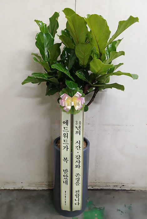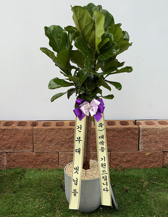 떡갈고무나무, 계절초화, 축하 메세지 리본 또는 카드.