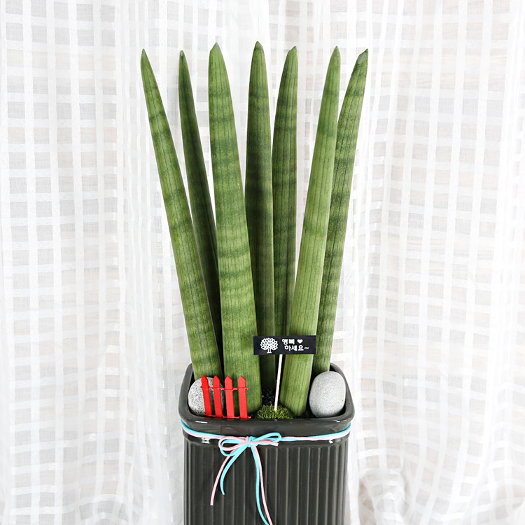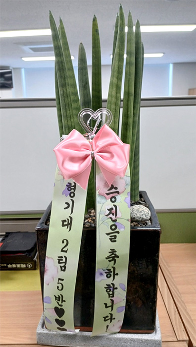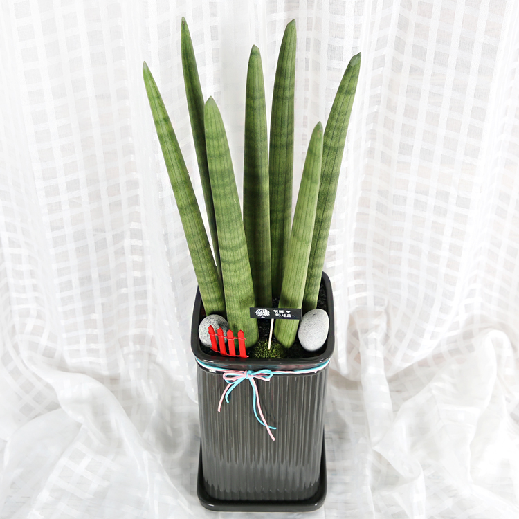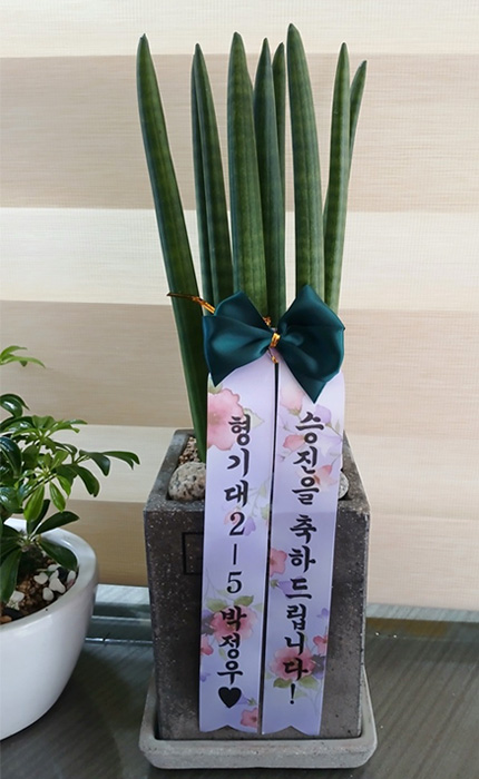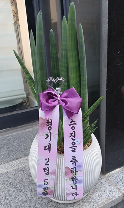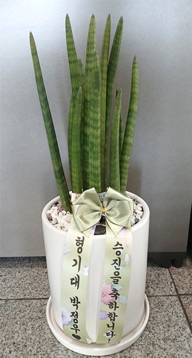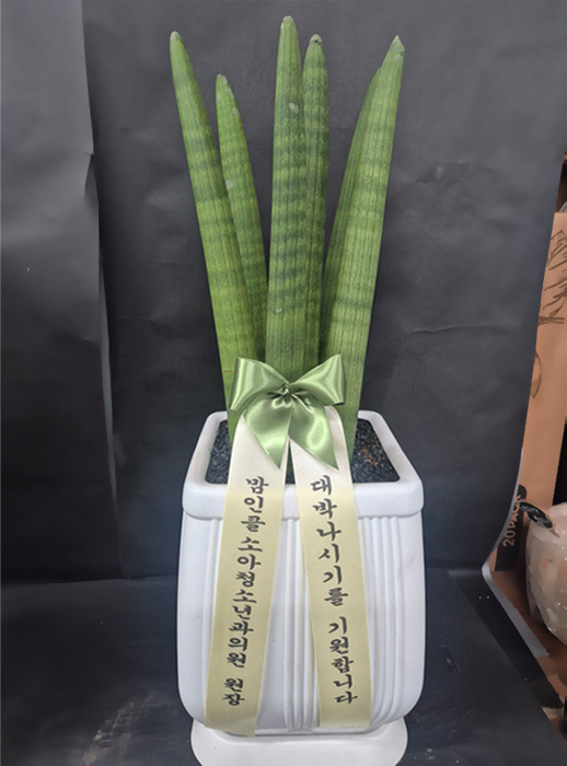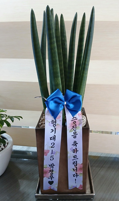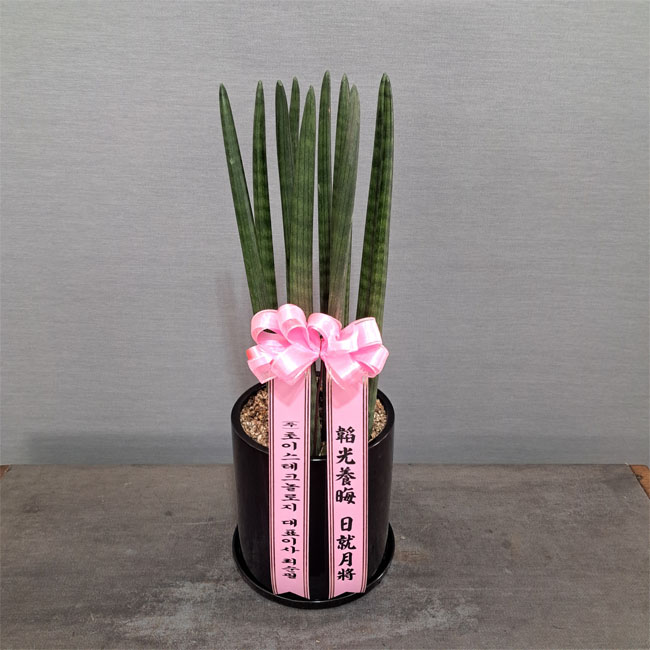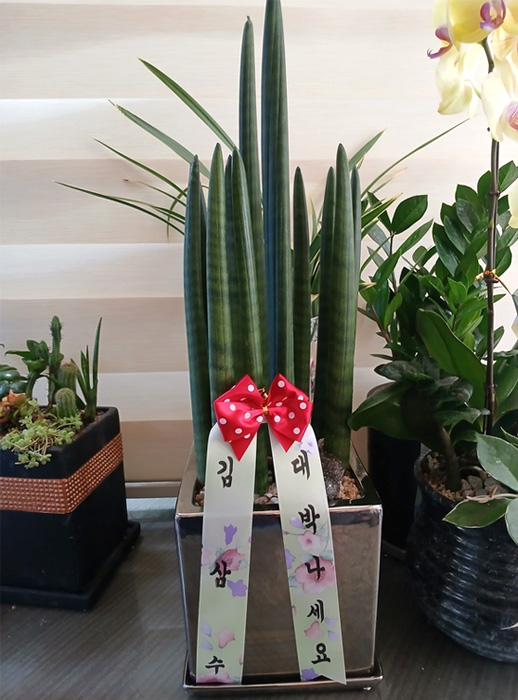 스투키, 계절초화, 축하 메세지 리본 또는 카드.