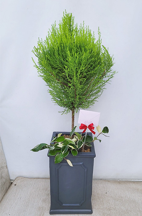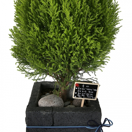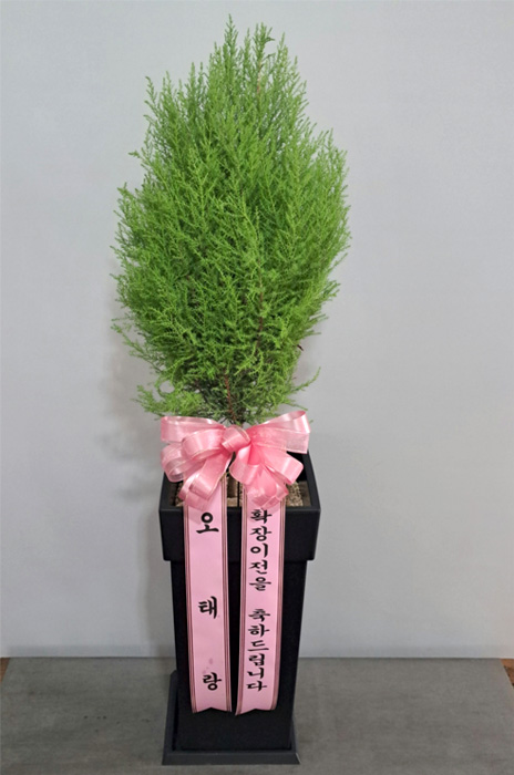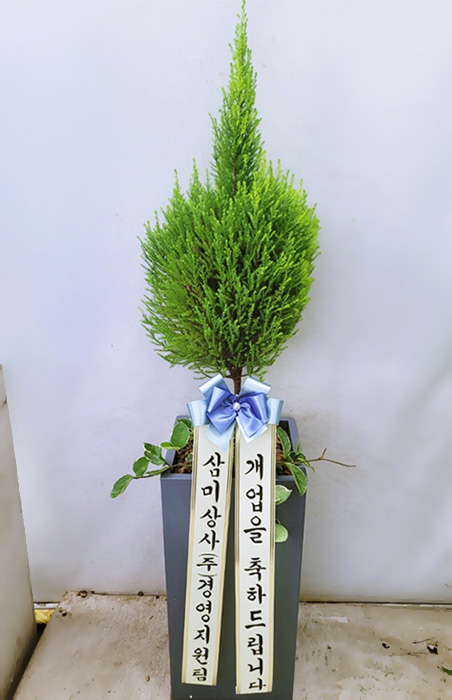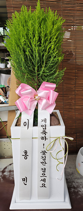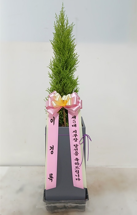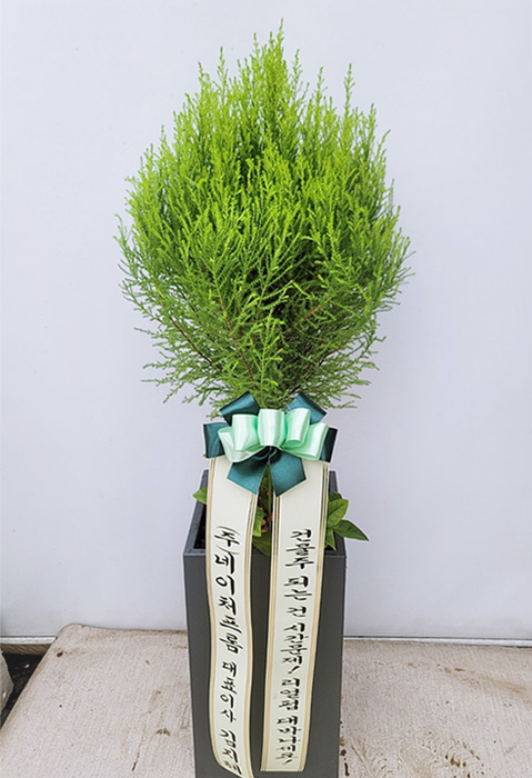 율마, 계절 초화, 축하 메세지 리본 또는 카드.