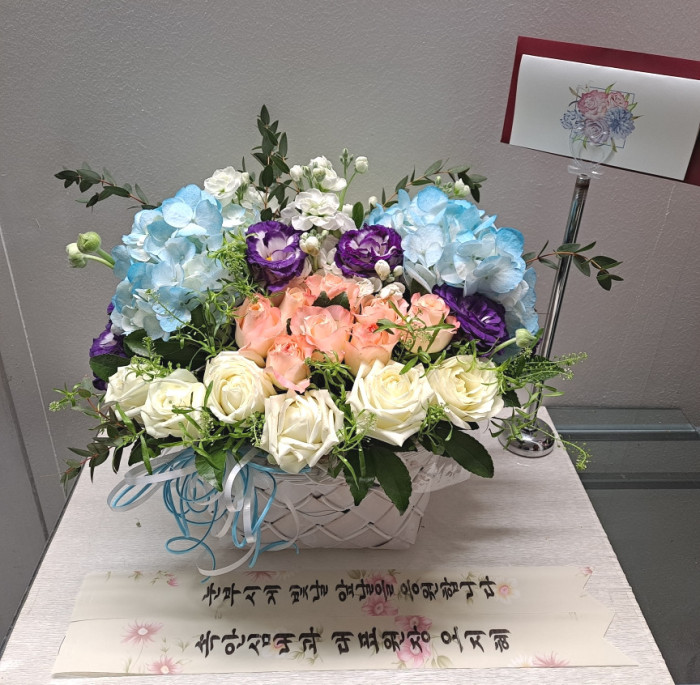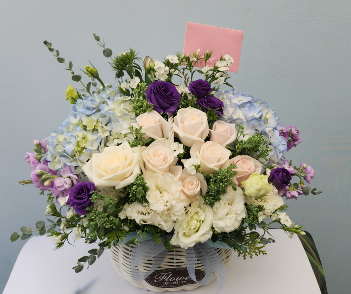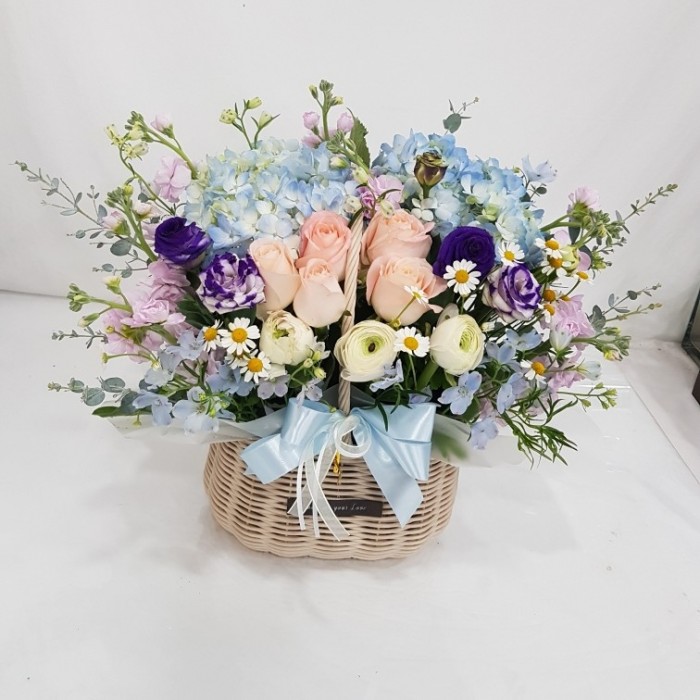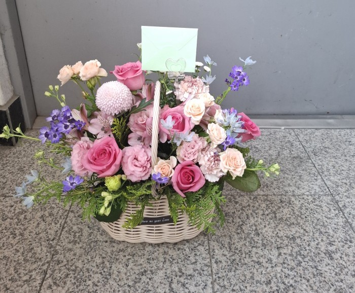 여러 색상의 장미, 각종 계절 꽃 및 계절 그린소재, 수제바구니, 리본 또는 카드.