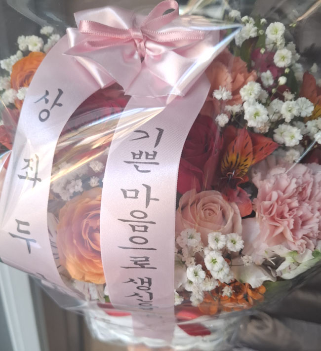 신청한지 단 2시간만에 신속하게 제작 전달해주셔서 너무 감사합니다~꽃도 너무 예쁘구요~적극 추천합니다 담에 또 이용할게요